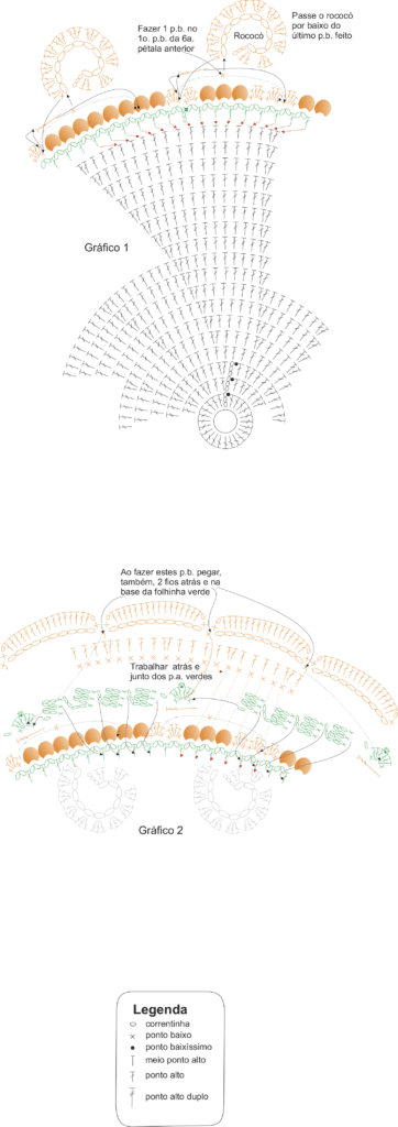 Acabamento: Prenda o Multicolor verde em qualquer p.a., suba com 5 corr e trabalhe *1 p.a. no próximo p.a., 2 corr*. Repita em toda a volta e termine com p.bxmo na 3ª carr inicial. Deixe o fio à espera na frente da peça. 2ª carr: Prenda o Multicolor amarelo em qualquer espaço de 2 corr e trabalhe neste espaço (1 p.b., 1 m.p.a., 2 p.a., 1 m.p.a., 1 corr). Repita nos próximos 8 espaços *e faça 1 p.b. no 1º p.b. da 6ª pétala anterior; 14 corr, 2 p.a. na 4ª corr a contar da agulha, 3 p.a. em cada das demais corr (rococó); passe por baixo do último p.b. feito e continue a carr fazendo 1 p.b. no próximo espaço de corr, 1 p.a.d. no último p.b. da 7ª pétala anterior, 1 m.p.a. na pétala começada, 2 p.a., 1 m.p.a., 1 p.b..