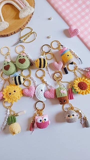 - Chaveiros de amigurumi: pequenos bichinhos ou personagens em crochê, sempre fazem sucesso entre crianças e adultos.