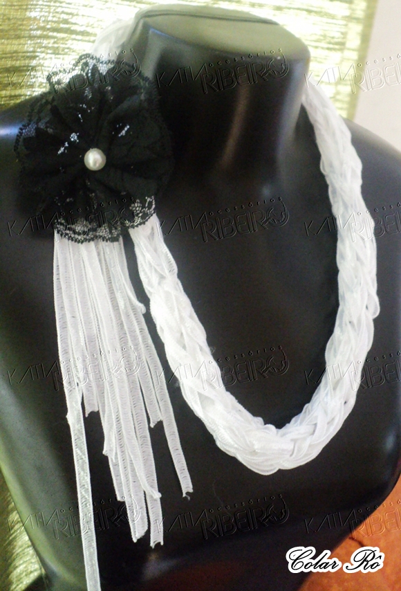 Olá amigas e queridas visitantes, hoje venho trazer lhes mais uma criação, esse colar foi feito especialmente por causa de um pedido de uma amiga que queria um colar para combinar com um vestido preto que ela está fazendo todo em crochê e aí , para minha surpresa me incumbiu que arrasasse no colar, ai ai rs me colocou numa fria rs mais como ganhei essas fitas da Estilotex resolvi juntar uma renda, uma pérola e umas franjas e aí surgiu esse colar …