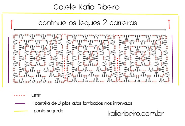 Fiz à partir de 3 quadrados grandes ( fiz um dos quadrados do tamanho das minhas costas e os outros dois do mesmo tamanho, fiz em duas cores , uni como mostro no gráfico abaixo ( sou totalmente leiga , me desculpem, tentem entender a legenda rs rs ) , subi mais duas carreiras de leques na parte superior , na lateral fiz 3 pontos altos tombados e fui prendendo nos intervalos, depois fiz uma carreira de ponto segredo prendendo bem perto.