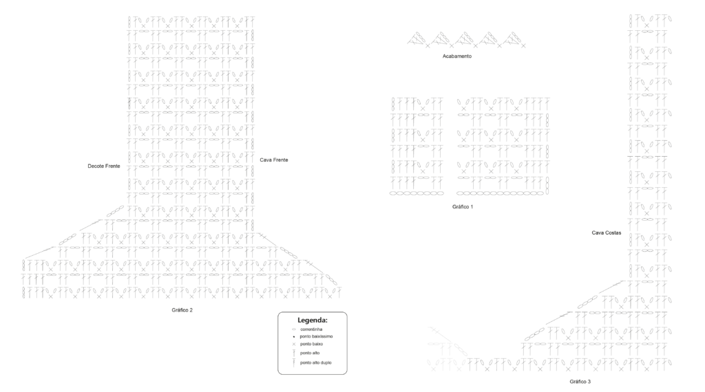 Seguinte esta base, o processo continua com repetições de carreiras, alternando entre pontos de crochê, até atingir o comprimento de 71 cm. As diminuições para a cava e decote são ajustadas conforme indicado nos gráficos.