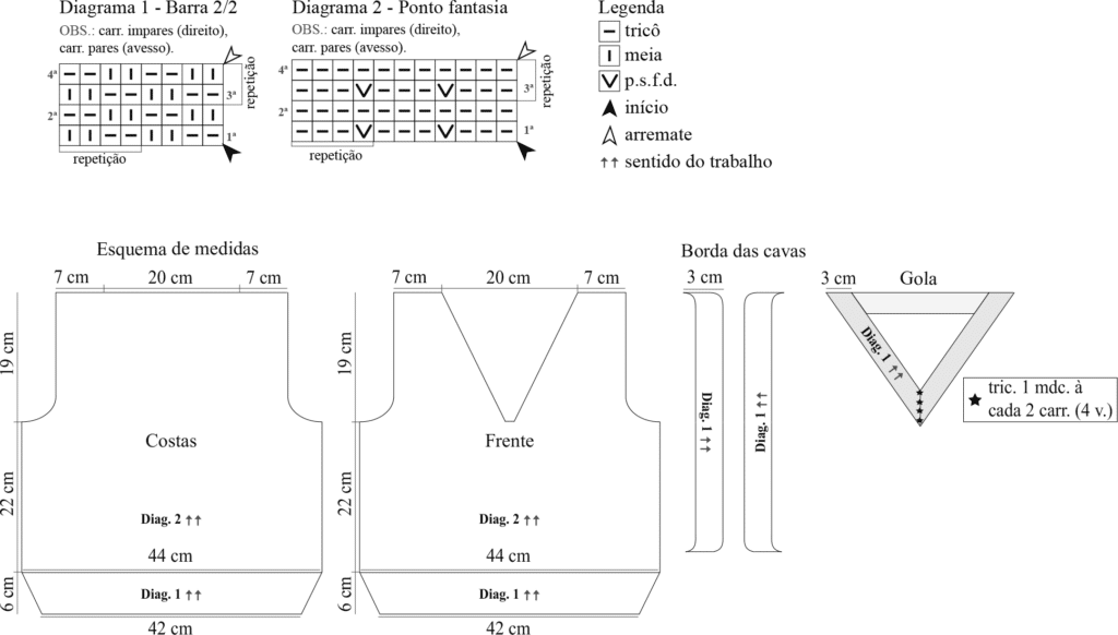 Costas: Use o fio Comfy na cor gerânio e monte 76 pts. na ag. circular de 5,0 mm, inicie a peça em barra 2/2 acomp. o diag. 1 e os pts. de rep. por 6 cm. Ao fazer a última carr. do p. barra 2/2 aum. altern. 3 pts., total 79 pts. Mude para a ag. circular de 6,0 mm prossiga a peça no p. fantasia acomp. o diag. 2 e os pts. de rep.. À 28 cm de comp. dê início as cavas, dim. de cada lado 10 pts. (1 v.), total de 59 pts. À 47 cm de comp. rem. todos os pts. e reserve a peça. Frente: Use o fio Comfy na cor gerânio e monte 76 pts. na ag. circular de 5,0 mm, inicie a peça em barra 2/2 acomp. o diag. 1 e os pts. de rep. por 6 cm. Ao fazer a última carr. do p. barra 2/2 aum. altern. 3 pts., total 79 pts. Mude para a ag. circular de 6,0 mm prossiga a peça no p. fantasia acomp. o diag. 2 e os pts. de rep.. À 28 cm de comp. dê início tric. as cavas e o decote simult. Nas cavas dim. de cada lado 10 pts. (1 v.). Para o decote rem. 3 pts. centrais e tric. de cada separadamente dim. A cada 4 carr. 2 pts. (2 v.) e 1 (9 v.). À 47 cm de comp. rem. os 15 pts. de cada ombro e reserve a peça. Montagem dos ombros: Use a ag. de tapeçaria e o fio Comfy na cor gerânio, una os ombros (7 cm). Borda das cavas: Use o fio Comfy na cor gerânio, levante ao redor da cava 88 pts. na ag. circular de 5,0 mm. Tric. a borda em p. de barra 2/2 acomp. o diag. 1 e os pts. de rep. por 3 cm. Rem. todos os pts., faça a outra borda da mesma maneira. Gola: Use o fio Comfy na cor gerânio e monte 32 pts. (decote costas), 50 pts. em cada lado do decote parte da frente. Total de 132 pts. e tric. a gola acomp. o diag. 1 e os pts. de rep.. Para formar o decote em V, no centro da parte da frente à cada 2 carr. faça um mdc. (4 v.). À 3 cm de comp. do início rem. todos os pts. Mude para a ag. de tapeçaria e feche a lateral da gola com pts. de alinhavo.