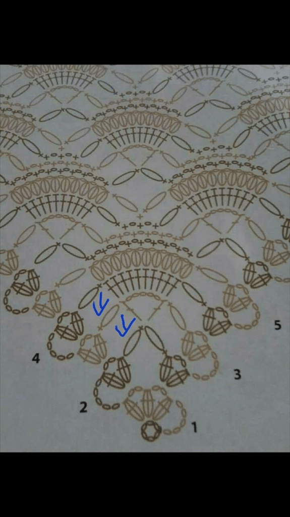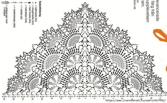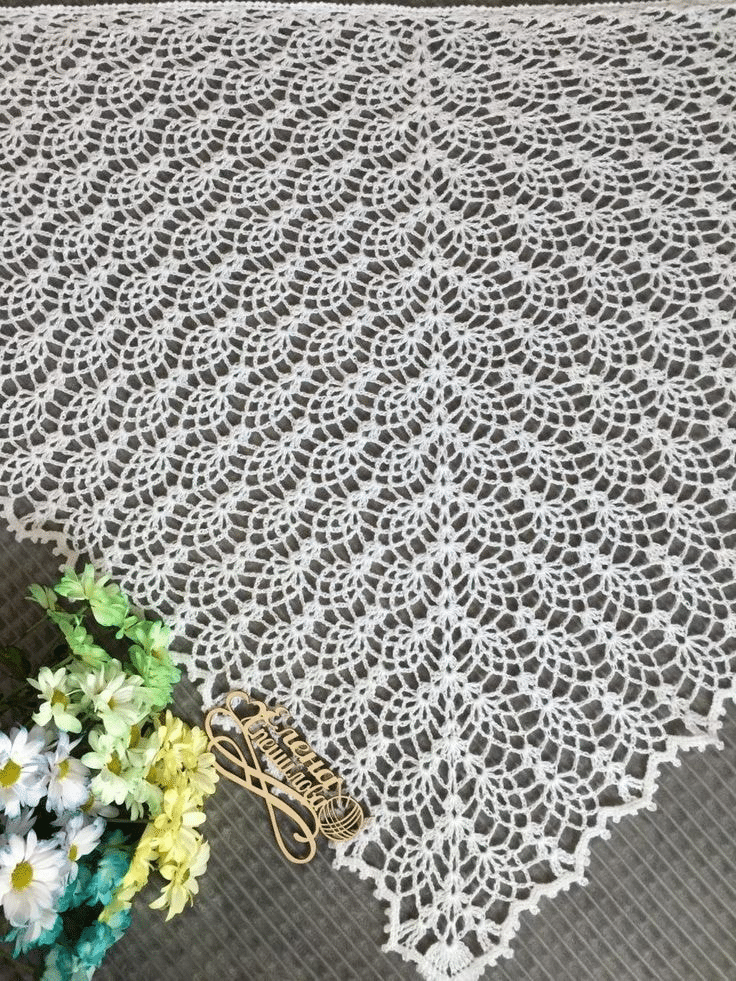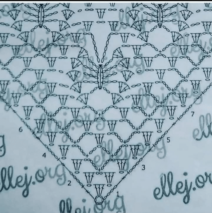 Faça uma corr. de 308 p. e trabalhe em p. fantasia seguindo o gráfico, repita de * a * (28 v.). Trabalhe as laterais do xale seguindo as laterais do gráfico para formar a ponta. Trabalhe até terminar todos os p.. Terminado a parte do do triangulo, faça nas duas laterais menores o barrado seguindo o gráfico.