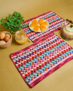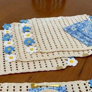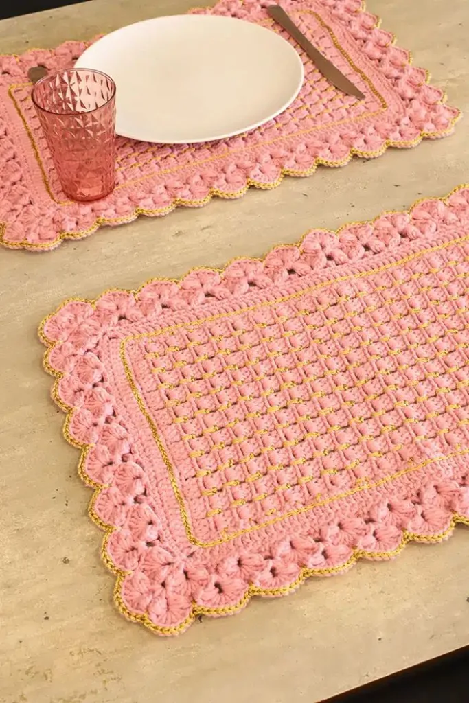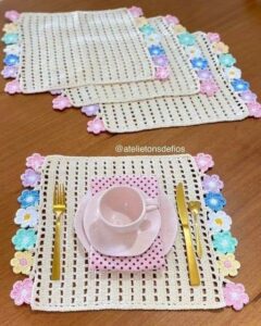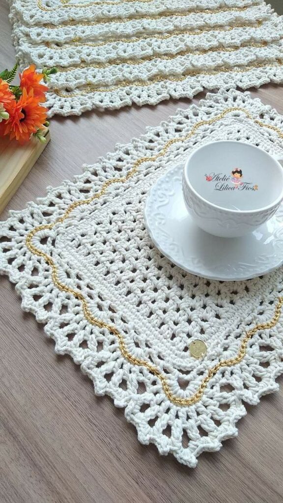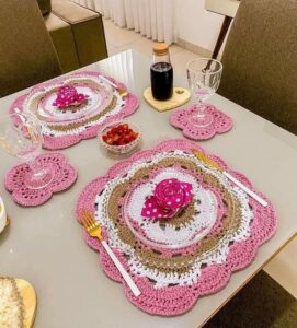 - Estilo Único: O crochê permite a criação de um estilo único para a sua mesa. Você pode combinar cores que harmonizem com a decoração do ambiente ou escolher fios com diferentes texturas, como os que possuem brilho ou efeito degradê, para dar um toque especial.
