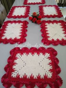 - Variedade de Modelos: Outra grande vantagem do jogo americano de crochê é a diversidade de modelos disponíveis. Se você prefere algo mais tradicional, pode optar por peças em cores neutras ou com padrões simples. Mas se a ideia é inovar, há infinitas possibilidades – desde desenhos geométricos até formatos temáticos, como frutas, flores ou até mesmo peças com um toque natalino.