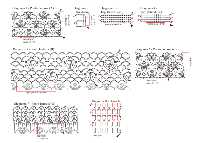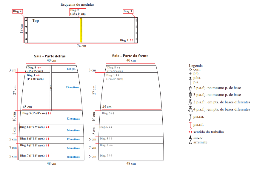 Pontos utilizados no crochê: corr.: correntinha, p.b.: ponto baixo, p.bx.: ponto baixíssimo, p.a.: ponto alto, 2 p.a.f.j. no mesmo p. de base: 2 pontos altos fechados juntos no mesmo p. de base, 3 p.a.f.j. no mesmo p. de base: 3 pontos altos fechados juntos no mesmo p. de base, 3 p.a.f.j. em pts. de bases diferentes: 3 pontos altos fechados juntos em pts. de base diferentes, 4 p.a.f.j. em pts. de bases diferentes: 4 pontos altos fechados juntos em pts. de base diferentes, p.a.r.a.: p. alto em relevo pegando por trás do p. da carr. anterior, p.a.r.f.: p. alto em relevo pegando pela frente do p. da carr. anterior, p. fantasia (A): siga o diag. 1; tira do top: siga o diag. 2; top (lateral esq.): siga o diag. 3, top (lateral dir.): siga o diag. 4, p. fantasia (B): siga o diag. 5; p. fantasia (C): siga o diag. 6; p. fantasia (D): siga o diag. 7; barra 1/1: siga o diag. 8.