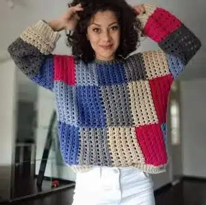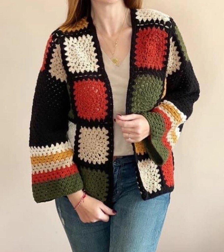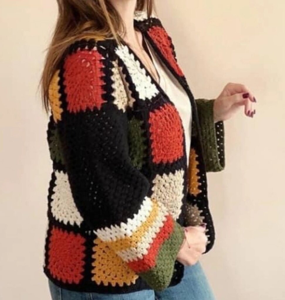 - Cardigan colorido em squares – criativo e cheio de personalidade.
