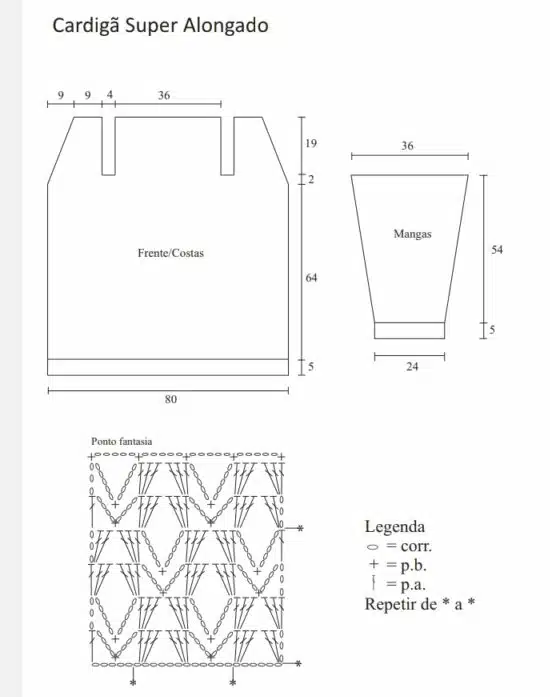 - Mangas: faça dois retângulos menores em ponto alto, costure nas cavas e ajuste o comprimento.