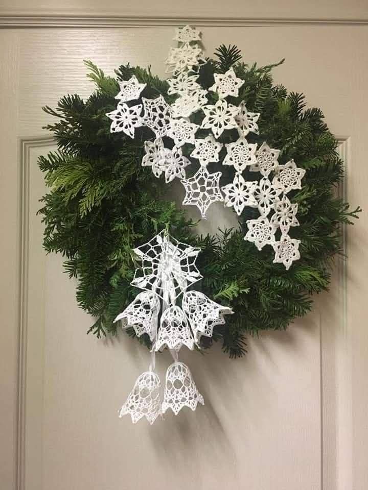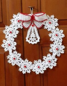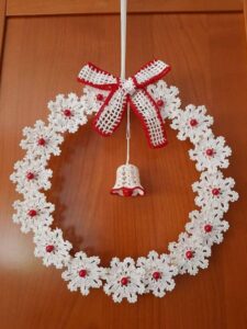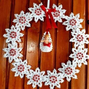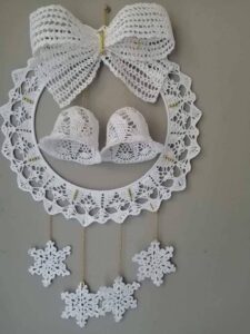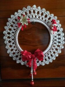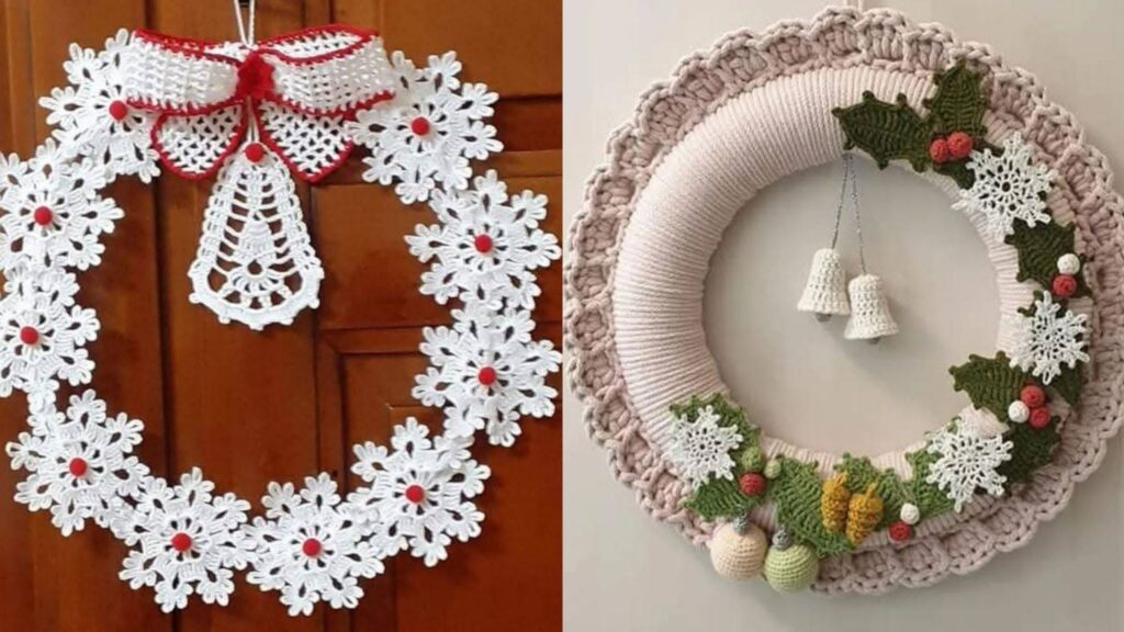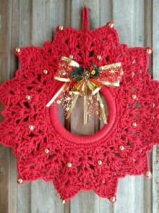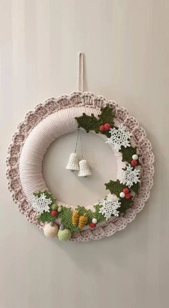 - Guirlanda de Natal: Use fios nas cores tradicionais de Natal, como vermelho, verde, branco e dourado. Adicione pequenos enfeites de Natal em crochê, como estrelas, sinos e árvores.