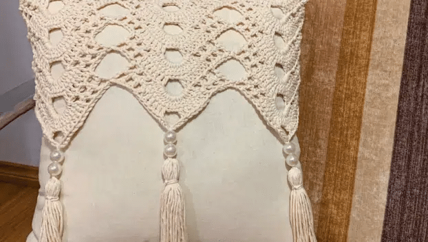 Assim vai repetindo as carr. formando 10 pontas cada lado, nas laterais; Quando fizer a segunda tira vai prender todas as pontas com as da primeira tira com p.b. e segue os mesmos p. Na terceira tira do mesmo modo, vai prender com 1 p.b. nas pontas. Dobre ao meio e prenda as pontas laterais com agulha de tapeceiro, formando uma capa. Faça a almofada com tecido de sua preferencia e coloque a capa de croche. Ficara ate a metade da almofada. Nas corr. que ficaram para baixo (circulo) fazer tassel para cada.