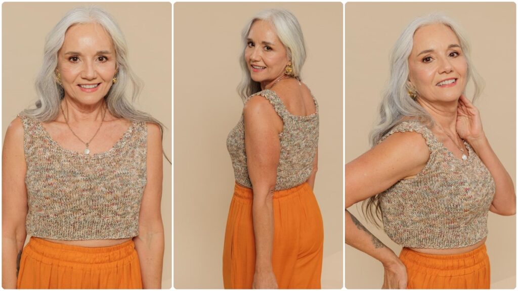 Na execução, as cavas e o decote são modelados por meio de diminuições cuidadosamente calculadas. Tanto na frente quanto nas costas, os pontos vão sendo deixados à espera ou diminuídos conforme o padrão, de modo a garantir o caimento perfeito. A montagem é finalizada com costura dos ombros e aplicação do bico de crochê, valorizando ainda mais o acabamento manual.