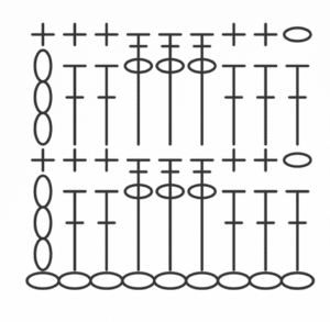 - A partir de agora cada carr. será de uma cor. Faça o seguinte o ponto fantasia: 3 pa, 3 corr, 3 pa consecutivamente, como indicado no gráfico ao final da receita. É preciso fazer aumentos utilizando o pV em toda peça: na parte correspondente das mangas, faça aumentos(pV) seguidos para criar o babado e na parte correspondente à frente e costas aumentos aleatórios de acordo com a necessidade para o seu tamanho.
