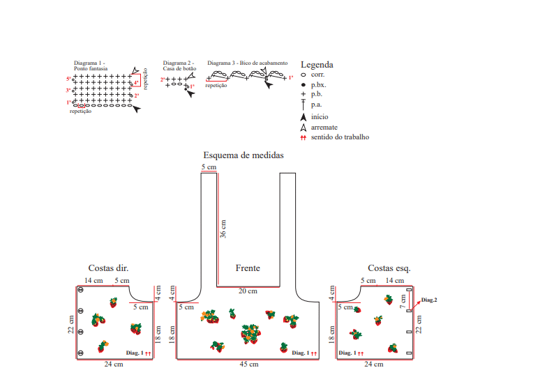 Pontos utilizados no crochê: Corr.: correntinha, p.bx.: p. baixíssimo, p.b.: p. baixo, p.a.: p. alto, p. fantasia: siga o diag. 1, casa para botão: siga o diag. 2, bico de acabamento: siga o diag. 3. Pontos utilizados no bordado: p. matiz, p. margarida, nó francês, p. atrás. Abreviaturas: Acomp.: acompanhando, ag.: agulha, carr.: carreira, comp.: comprimento, diag.: diagrama, dir.: direita, esq.: esquerda, nov.: novelo, p.: ponto, pts.: pontos, rep.: repetição ou repetições, rem.: rem., trab.: trabalhe. Amostra: Um quadrado de 10cm em p.b., na ag. de 2,5mm = 20 pts. x 18 carr..