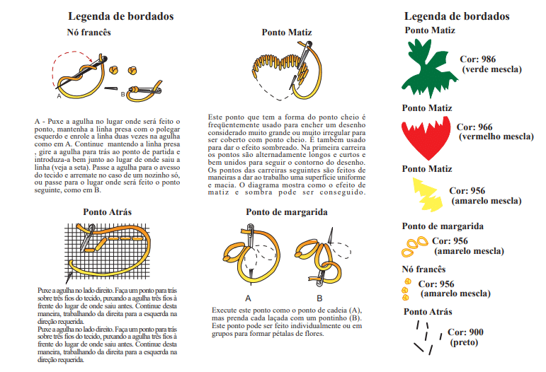 Bordado: Transfira o risco para o cropped acomp. os riscos da parte da frente e das costas dir. e esq.. Borde com o fio Maxi Mouline (3 fios) e ag. para bordado nº 24, siga a legenda de pts. para bordar o p. matiz, p. margarida, nó francês e p. atrás.