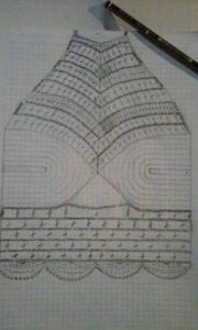 Comece pelos bojos. Bojo – Com o fio off-white faça uma corr. de 11 p. e trabalhe em círculo o bojo seguindo o gráfico. Trabalhe o gráfico espelhado a partir da indicação do p. central. Trabalhe todos os p. a. do bojo a cada 2 carr. em p. a. em relevo. Terminado o gráfico rem.. Faça 2 bojos iguais. Com os dois bojos prontos faça com o fio off-white uma corr. de 8 p. para uni-los.