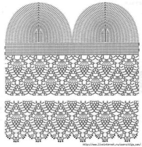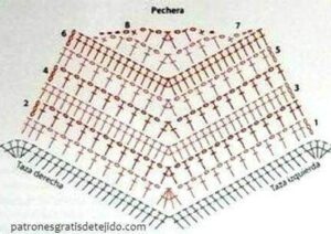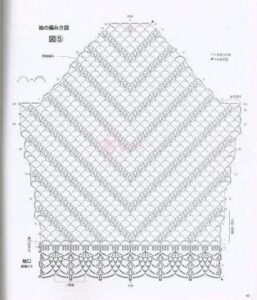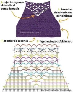 Com o fio na cor Musgo faça nas duas laterais e na borda inferior do top o bico seguindo o gráfico. Com o fio na cor Musgo faça uma corr. de aproximadamente 180 cm de comprimento com 2 fios. Passe esse cordão em forma de cadarço entre os p. do bico das laterais.