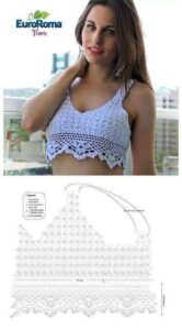Com o fio na cor Off-White faça ao longo dos 2 bojos uma carr. em p. b., na corr. do início do p. fantasia e na lateral do p. fantasia uma carr. em p. a. e rem.. Alça – Prenda o fio Off-White no alto do bojo (veja molde) e faça uma corr. de 65 p. e prenda na de trás do top a 6 cm da borda, faça uma carr. em p. a. ao longo da corr. e rem. Faça com o fio musgo ao longo da alça uma carr. em p. b. e rem.. Faça as duas alças iguais.