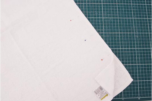 - Com o auxílio da base de corte, do cortador circular e da régua, recorte os panos de copa, eliminando a faixa usada para bordar. Em seguida, recorte um dos panos de copa ao meio, no sentido horizontal.