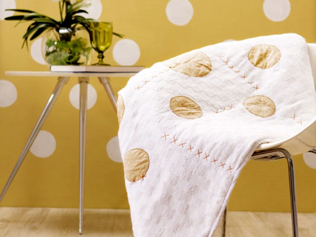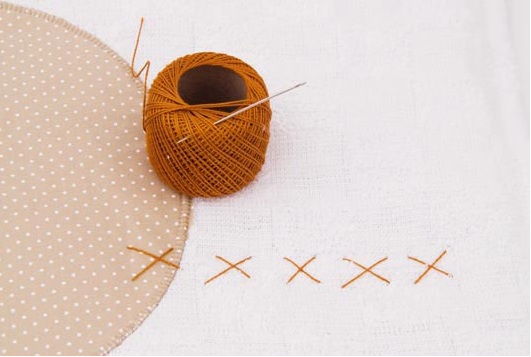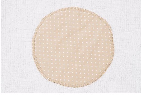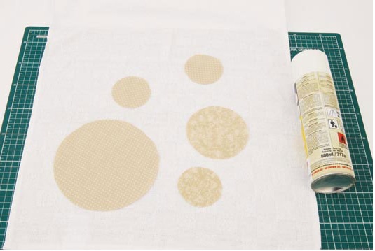 - Espalhe cola no avesso dos círculos e, em seguida, distribua-os aleatoriamente na manta formada com os panos de copa. Passe uma costura caseada à máquina ou à mão ao redor de cada círculo.