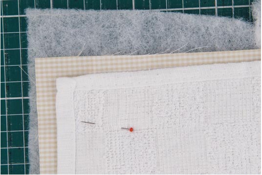 - Com o auxílio dos alfinetes, junte os tecidos inteiros e as metades do passo anterior, direito com direito, formando uma única peça. Passe uma costura reta à máquina nas laterais para unir.