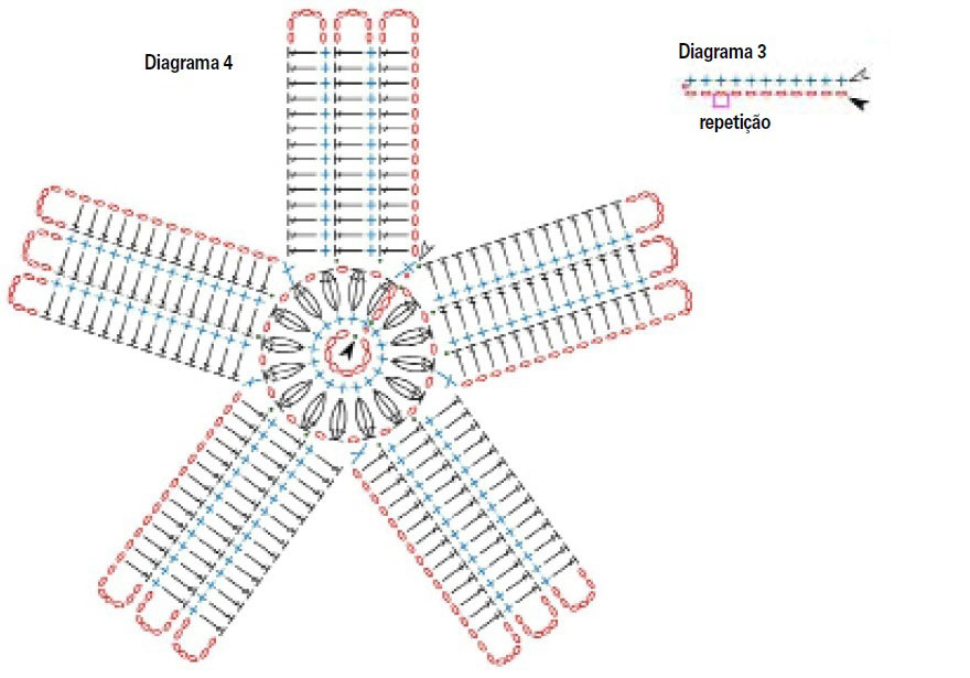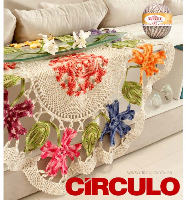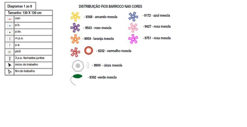 O próximo passo é fazer os arabescos e as flores. Usando o fio Barroco 9900, faz-se um cordão de 5 metros em correntinhas, trabalhado em ponto baixo seguindo o diagrama 3. As flores são feitas utilizando os fios Barroco nas cores relacionadas na lista de material. Cada flor é iniciada com um cordão de 9 correntinhas, fechado com um ponto baixíssimo, seguindo o diagrama 4 a partir da segunda carreira. As folhas são feitas com o fio Barroco na cor 9392, iniciadas com 24 correntinhas e seguem o diagrama 6. Após a confecção dessas partes, reserve todas as peças.