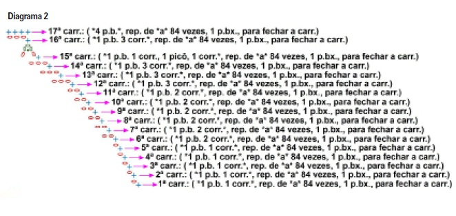 O primeiro passo para realizar o projeto é iniciar com um cordão de 8 correntinhas fechado com um ponto baixíssimo. Na primeira carreira, faça 1 correntinha, 16 pontos baixos, e feche novamente com um ponto baixíssimo. Do segundo ao décimo sétimo carreira, continue seguindo o diagrama 1, trabalhando em carreiras circulares e fechando cada carreira com um ponto baixíssimo. Após completar estas etapas, arremate o fio e reserve a peça. Mude para o fio Barroco 9900 e siga o diagrama 2, trabalhando em carreira circular e fechando cada um com 1 ponto baixíssimo.