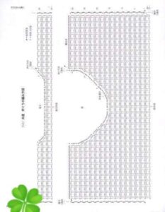 Costas – Primeiramente, faça uma corr. de 105 p. mais 3 corr. para virar e trabalhe em p. fantasia seguindo o gráfico, repita de * a * no sentido dos p. (35 v.). Assim, a 67 cm do início do trabalho, para o decote deixe de fazer os 22 p. centrais e trabalhe cada lado separadamente, deixe de fazer do lado do decote em cada carr.: 5 p. (5 v.) e rem..