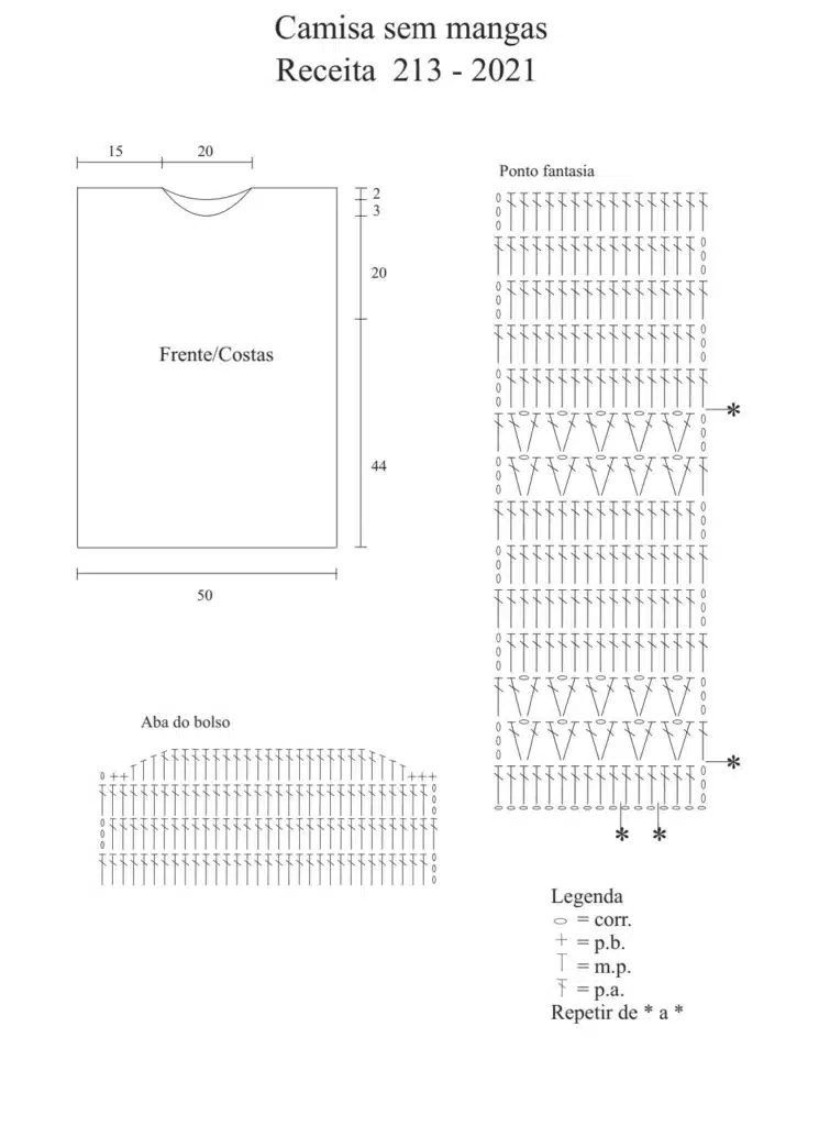 Acabamento: Então, costure os ombros. Assim, costure os lados, deixe 25 cm de cada lado das costuras dos ombros sem costurar para as cavas. Então, faça a toda volta de cada cava, decote e da borda inferior da camisa 1 carr. em p. b., 1 carr. e p. caranguejo e rem.. Costure o bolso na frente a 5 cm da costura lateral esquerda e a 20 cm do ombro. Assim, costure a aba do bolso acima do bolso.