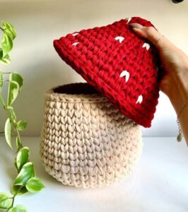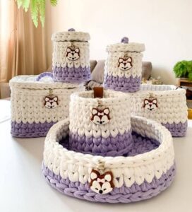 3. Vasos e Cestos Vasos revestidos com crochê e cestos decorativos são ótimos para organização e embelezamento de ambientes. Eles podem ser usados para armazenar objetos ou simplesmente como elementos decorativos.