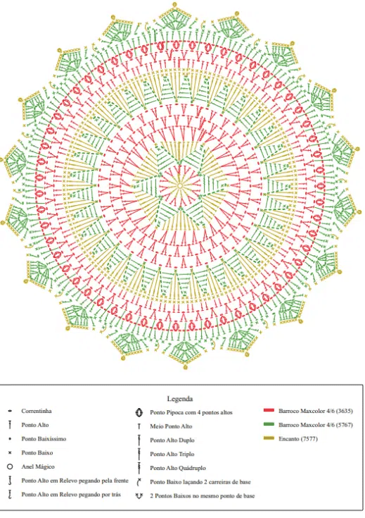 Pontos Utilizados: corr. (Correntinha); p.b.x. (Pnto Baixíssimo); p.a. (Ponto Alto); p.b. (Pto Baixo), p.a.r.f. (Pon Alto em relevo pegando pela frente), p.a.r.t. (Ponto Alto Relevo pegando por trás), p.p. (Ponto Pipoca com 4 pontos altos), m.p.a. (Meio Ponto Alto), p.a.d. (Ponto Alto Duplo), p.a.t. (Ponto Alto Triplo), p.a.q. (Poto Alto Quádruplo).