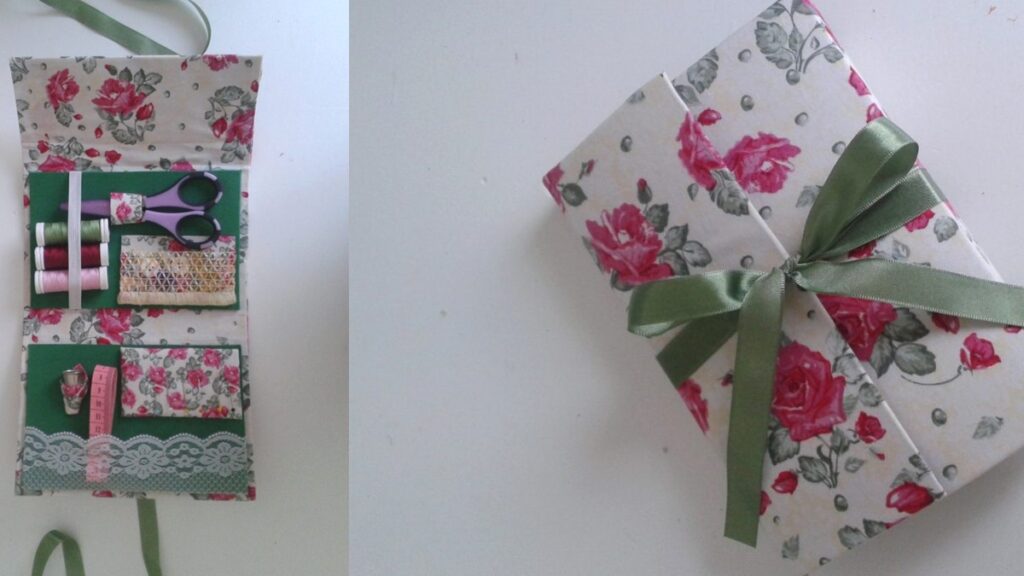 Por fim, cole todas as partes dentro da capa em seus devidos lugares. Deixe secar completamente e dobre nas linhas vinqueas. Complete o estojo com linhas, agulhas, alfinetes, colchetes, botões, tesoura, dedal e fita métrica. Finalize com uma fita nas laterais e amarre um laço para fechar.