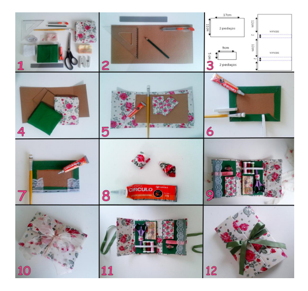 Antes de mais nada, clique em “VER GRÁFICO” para baixar as fotos do passo a passo. Será uma mão na roda para visualizar cada etapa. Agora, com a régua e o esquadro, risque e corte um retângulo de papelão na medida de 35 cm x 18 cm. Meça 12 cm e vinque com o estilete sem cortar. Em seguida, vinque mais 2 cm. Repita mais dois vincos após mais 12 cm.