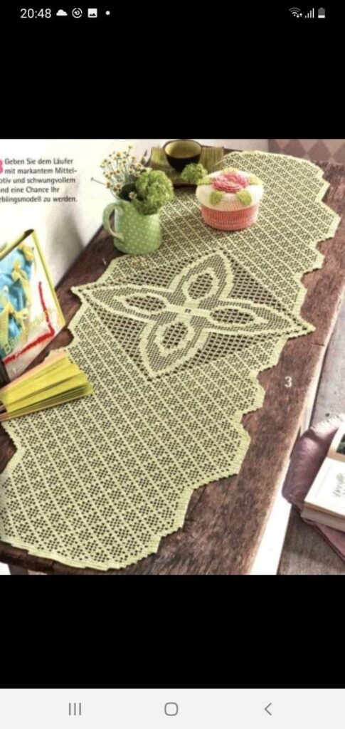 4. Beleza e Elegância: Não se pode negar a beleza e a elegância de um caminho de mesa em crochê filé. A delicadeza dos pontos, combinada com os padrões gráficos elaborados, cria uma peça que é ao mesmo tempo sofisticada e acolhedora.