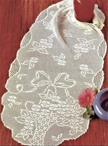 O termo “filé” significa “rede” em francês, uma alusão à natureza aberta e rendada do crochê filé. Esta técnica utiliza apenas pontos básicos de crochê, como correntinhas e pontos altos, criando espaços abertos que formam padrões gráficos quando combinados. É comum ver caminhos de mesa em crochê filé adornados com símbolos ou figuras que representam elementos naturais, como flores, pássaros e folhagens.