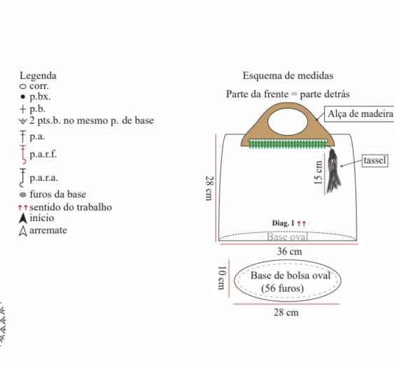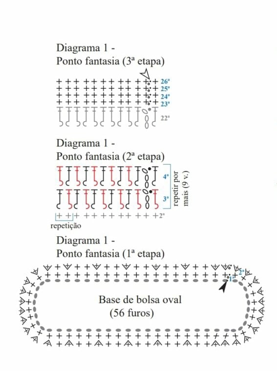 p.bx.: ponto baixíssimo, p.b.: ponto baixo, p.a.: ponto alto, p.a.r.f.: p. alto em relevo pegando pela frente do p. da carr. anterior, p.a.r.a.: p. alto em relevo pegando por trás do p. da carr. anterior, ponto fantasia: siga o diag. 1 (1ª, 2ª e 3ª etapas).