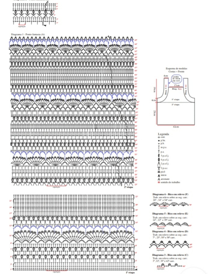 Logo depois, faça a frente parte superior até a cava – 1ª parte . Ademais, a agulha de crochê de 3,0mm e o fio Verano na cor acqua trab. em carr. de ida e volta. Inicie a peça pelo decote com um cordão de 61 corr., trab. no p. fantasia (A 1ª à 22ª carr.) acomp. o diag. 1, o p. de rep. e o molde para formar os aum. necessários para formar as cavas.. Rem. o fio e reserve a peça. Frente e costas parte inferior abaixo das cavas: 2ª etapa: Use a ag. de crochê de 3,0mm e o fio Verano na cor acqua trab. em carr. circulares no p. fantasia (A – 23ª à 65ª carr.) acomp. o diag. 1, o p. de rep. e o molde.