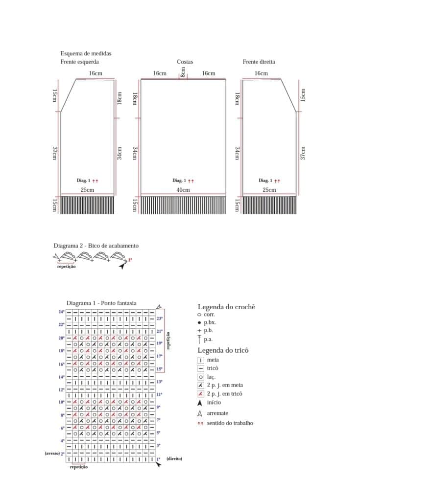 Abreviaturas: p.: ponto, pts.: pontos, rep..: repetição, v.: vezes, m.: meia, t.: tricô, laç: laçada, carr.: carreira, ag.: agulha, j.: juntos, v. – vezes, rem. – rematar, diag. – diagrama, meia torcido observe a indicação dele na legenda do tricô.