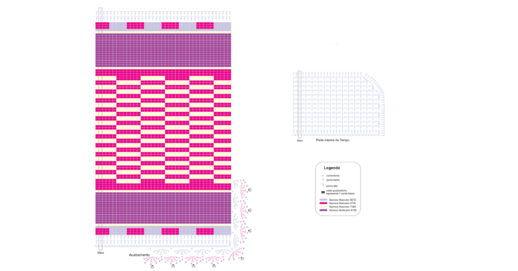 Então, cada quadradinho do gráfico representa 1 p.b. –*1 p.b. em cada dos próximos 5 p.a. retirando as 2 laçadas do último p.b. com o Maxcolorfucsia; trabalhar 1 p.b. fucsia em cada dos 5 p.a. seguintes cobrindo o fio cinza*. Repetir.