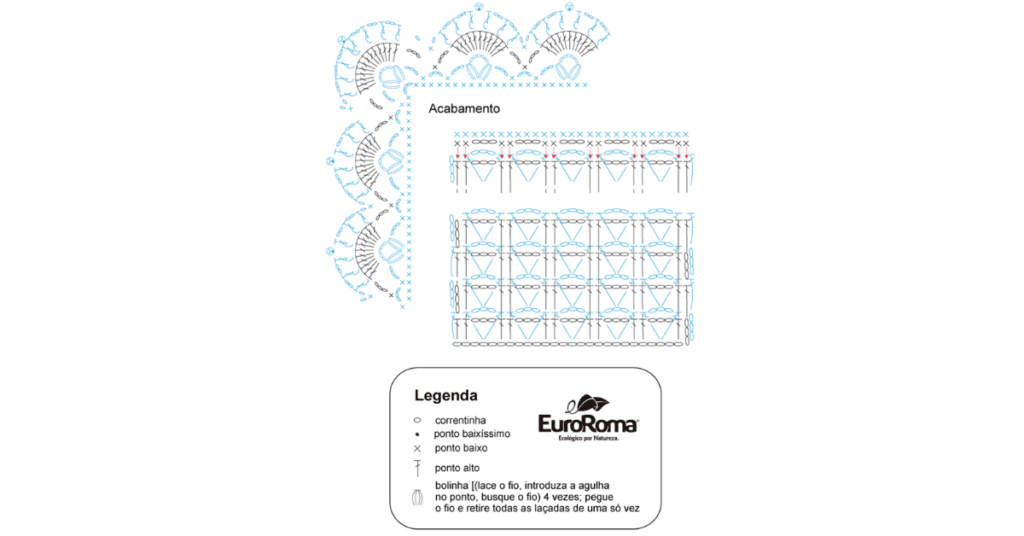 Logo depois, na 3ª carr: 3 corr, entre com a agulha na frente dos pontos azuis e trabalhe 1 p.a. no p.a. seguinte, *3 corr, passe a agulha atrás dos pontos azuis e faça 1 p.a. em cada dos 2 p.a. crus seguintes; 3 corr, entre com a agulha na frente dos pontos azuis e trabalhe 1 p.a. em cada dos próximos 2 p.a. crus*. Repita de * a * e no final da carr deixe novamente o fio à espera sem cortar. Repita a 2ª e 3ª carr até alcançar 59 cm. Passe as voltas de acabamento acompanhando o gráfico.