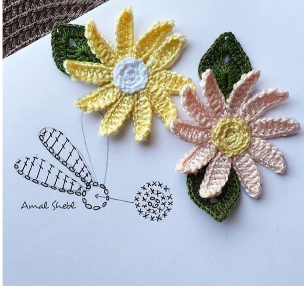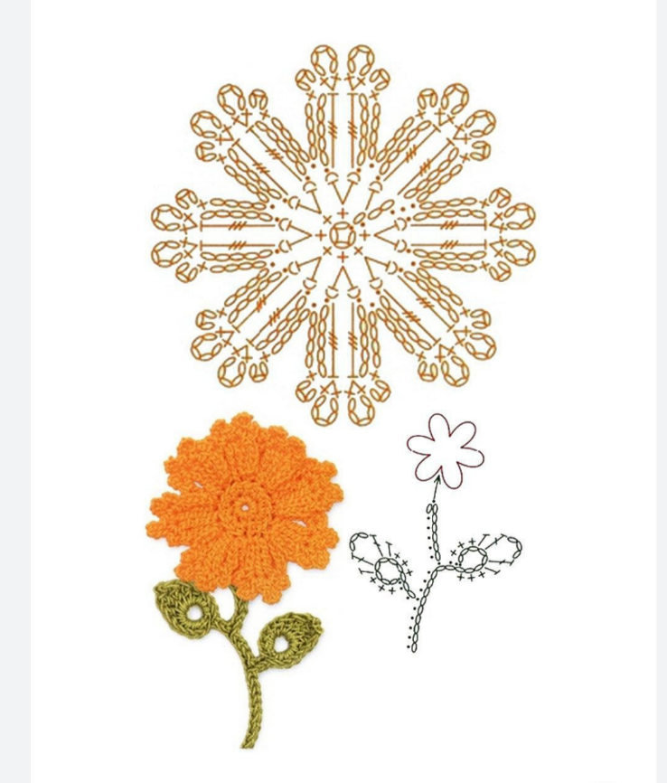 Diagramas de todos os elementos que compõem a (s) flor (es) de crochê