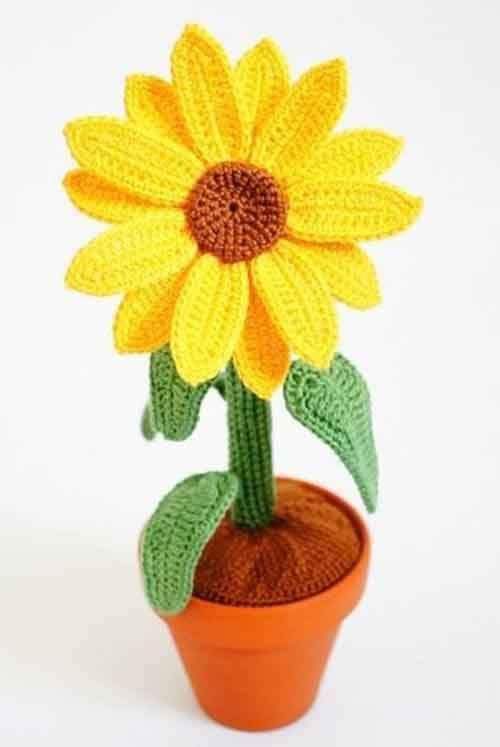 GIRASSOL DE CROCHÊ NO VASO DE PLÁSTICO