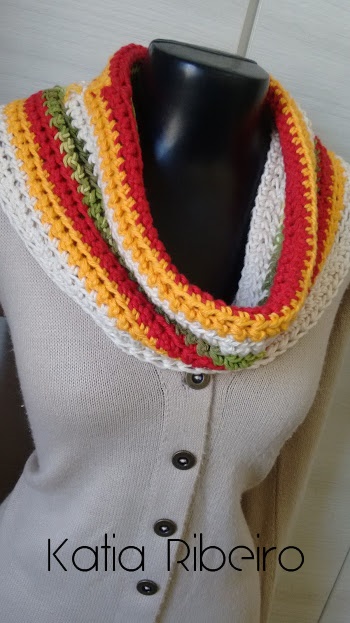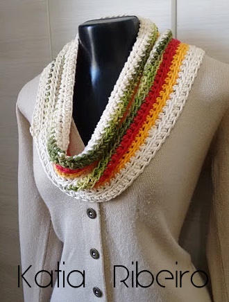 Fiz uma corrente de 60 cm ( pontos largos ) fechando com ponto baixíssimo em círculo ( crochê circular ), a próxima carreira fiz em meio ponto alto e a seguinte fiz com ponto baixo pegando a alça de trás da carreira anterior ( isso que faz com que fique aquele cordãozinho sobressalente ) usei 4 cores do fio BARROCO MAXCOLOR alternando as cores por 18 carreiras ( uma carreira de meio ponto e ponto baixo com a mesma cor e fui alternando desta maneira por 9 x ) . Ao final fiz uma pequena faixa com o mesmo ponto com 4 carreiras e fiz o ponto picô em toda volta, depois fiz um cordãozinho para prender o botão e fechar a gola em um dos lados o que você pode ver na foto postada.