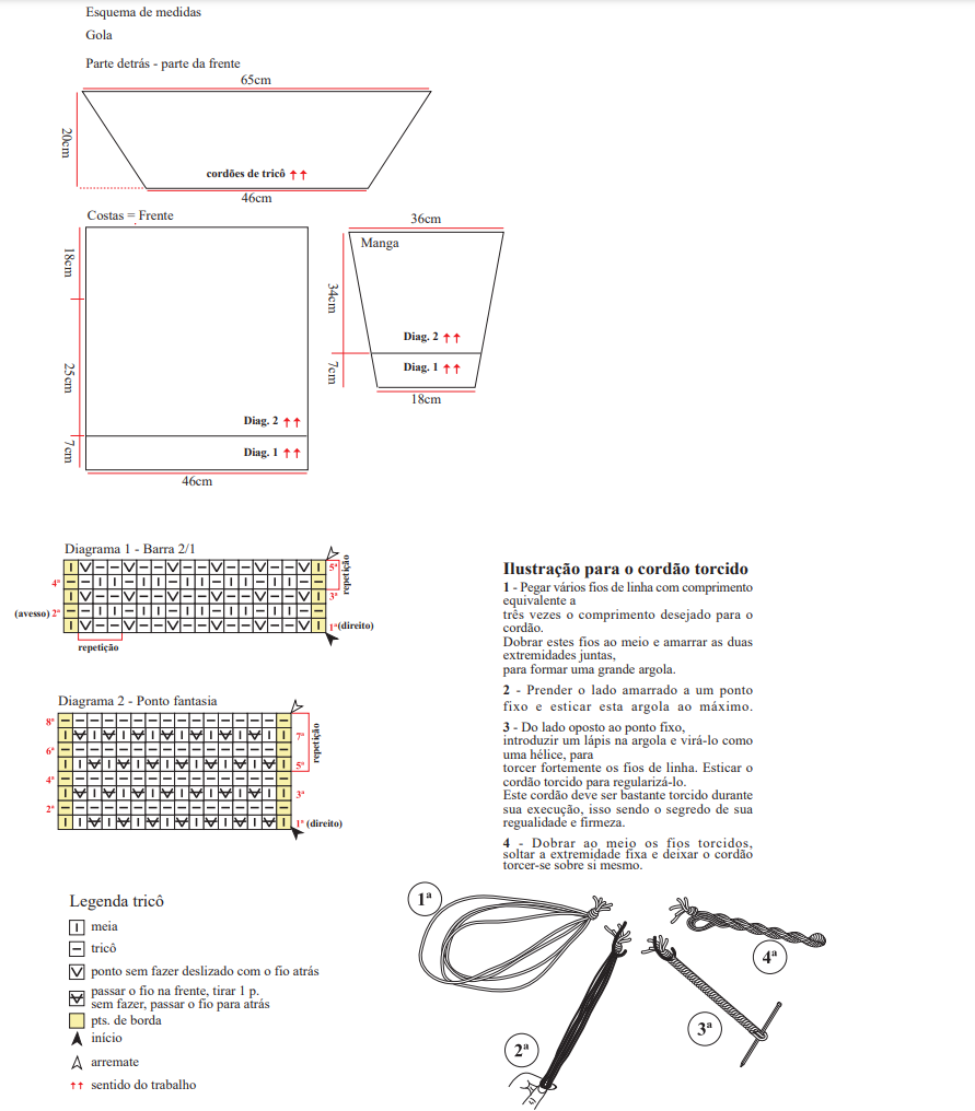 Use o fio Amiga na cor vermelho e monte 26 pts. na ag. de 6,0mm. Inicie a peça pelo punho em p. de barra 2/1 acompanhando o diag. 1 e os pts. de rep. por 7cm. Prossiga a peça no p. fantasia acompanhando o diag. 2 e os pts. de rep. À 18cm de comprimento desde o início, aum. de cada lado a cada 2 carr. 2 pts. (8 v.), totalizando na ag. 58 pts. À 41cm de comprimento desde o início, rem. todos os pts.