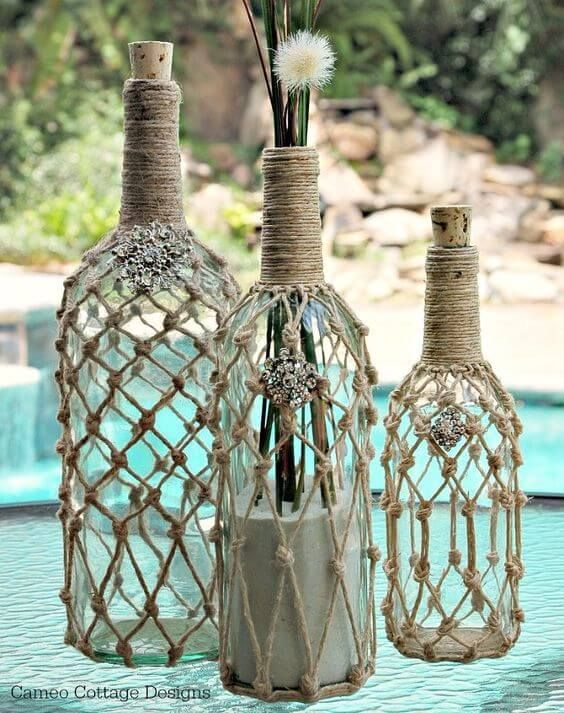 Dica: Experimente usar garrafas de vidro colorido para adicionar um efeito visual interessante ou misture garrafas com diferentes texturas e acabamentos.