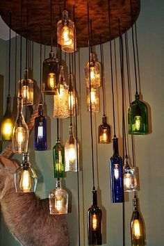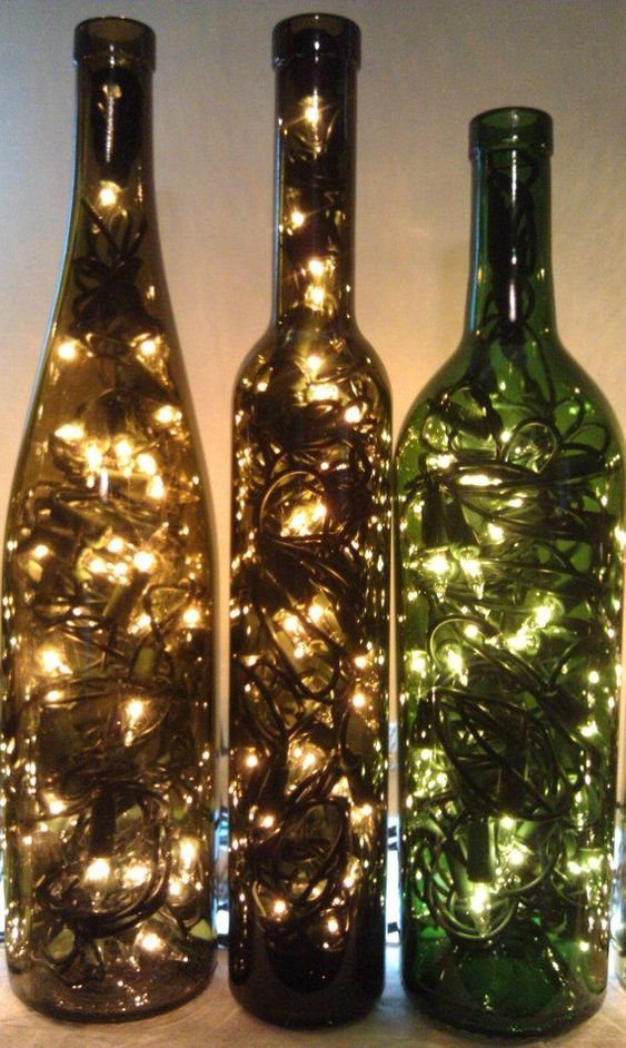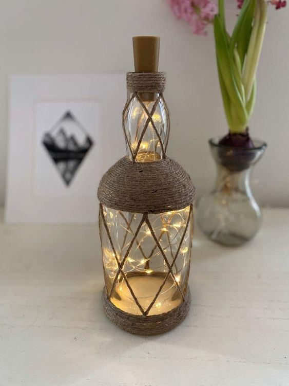 As garrafas podem ser transformadas em luminárias encantadoras. Coloque luzes de fada ou LEDs dentro das garrafas para criar uma iluminação suave e atmosférica. Para um visual mais sofisticado, corte a parte superior da garrafa e adicione um soquete de lâmpada.