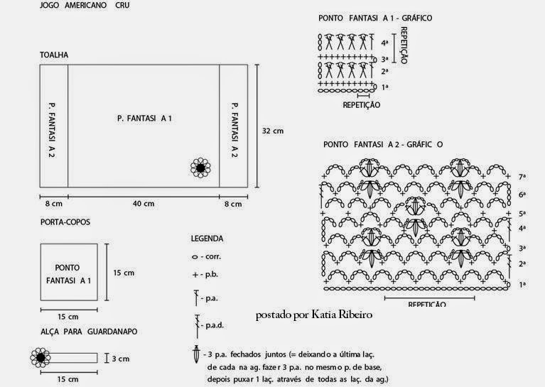 Ponto Alto Duplo (p.a.d.) – 2 laç., introduzir a ag. e puxar o p., (1 laç., rem. 2 p.) 2 vezes e com outra laç. rem. todas as laç. na ag. Ponto Fantasia 1 – seguir o gráfico.