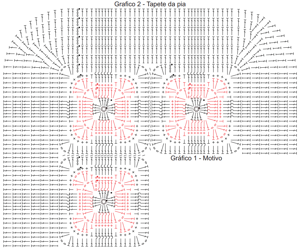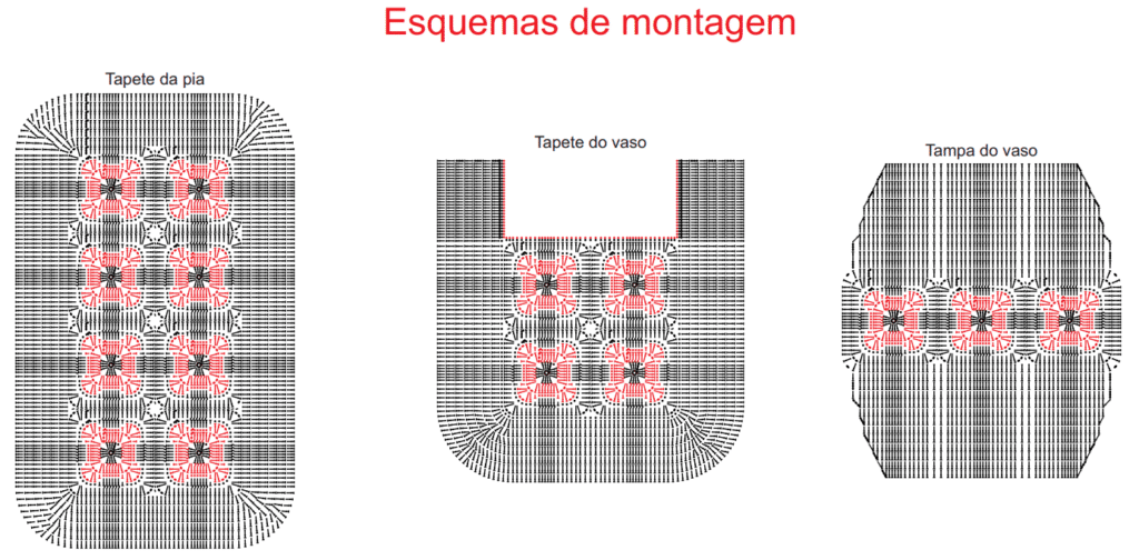 Tapete da pia: costurar 8 motivos como mostra o esquema de montagem. Com o fio na cor porcelana, seguir o gráfico 2 ao redor dos motivos unidos. Com o fio na cor malagueta, fazer a 1ª listra do gráfico 5 ao redor dos motivos unidos e, depois, de 2 em 2 carr. do tapete. Por fim, fazer o contorno ao redor da peça seguindo o gráfico 7.