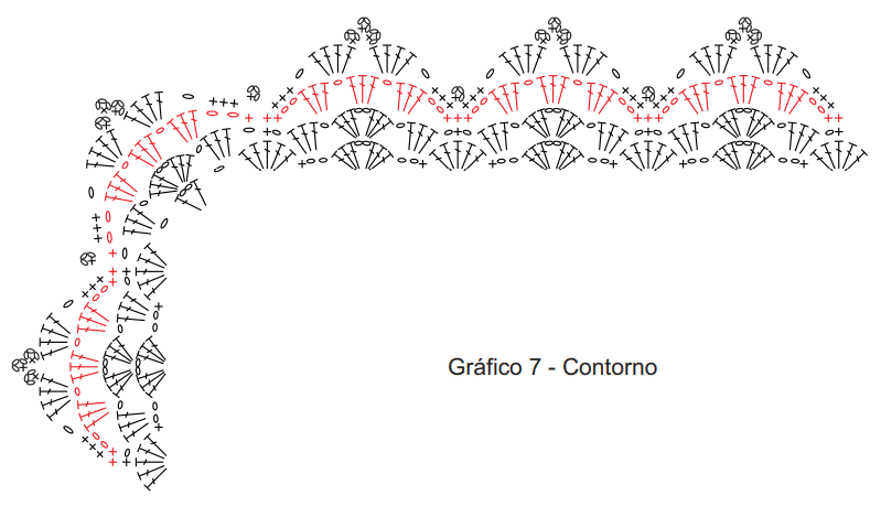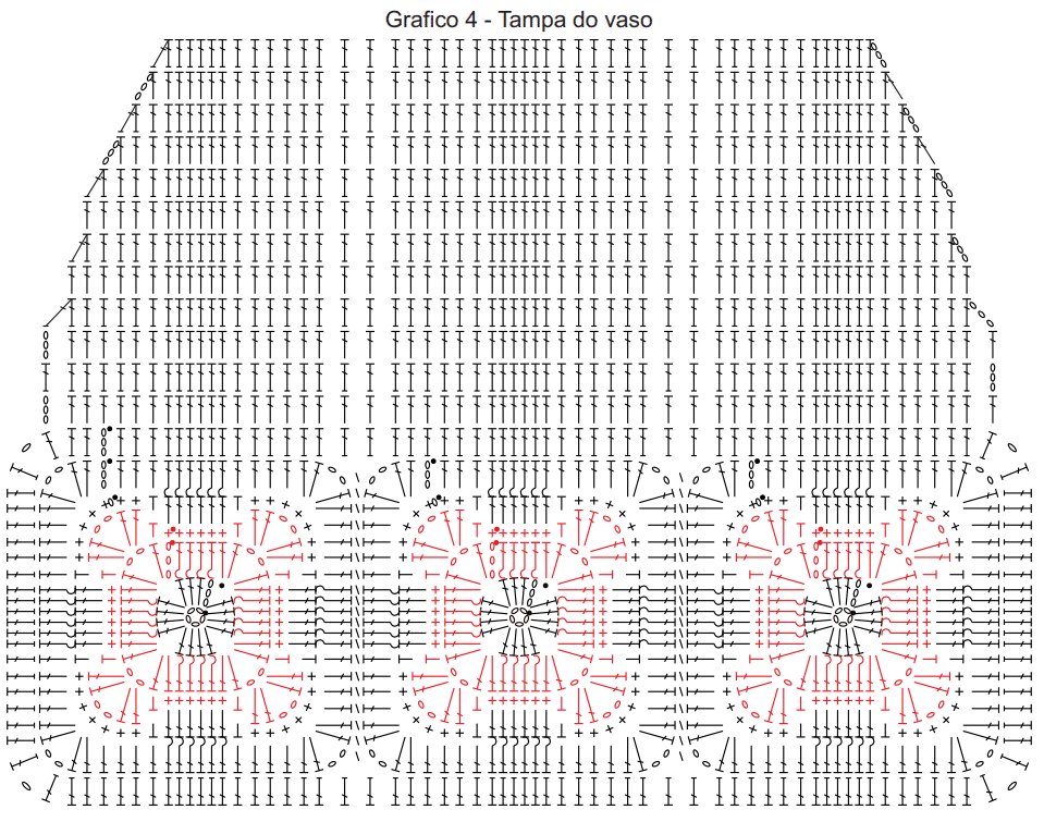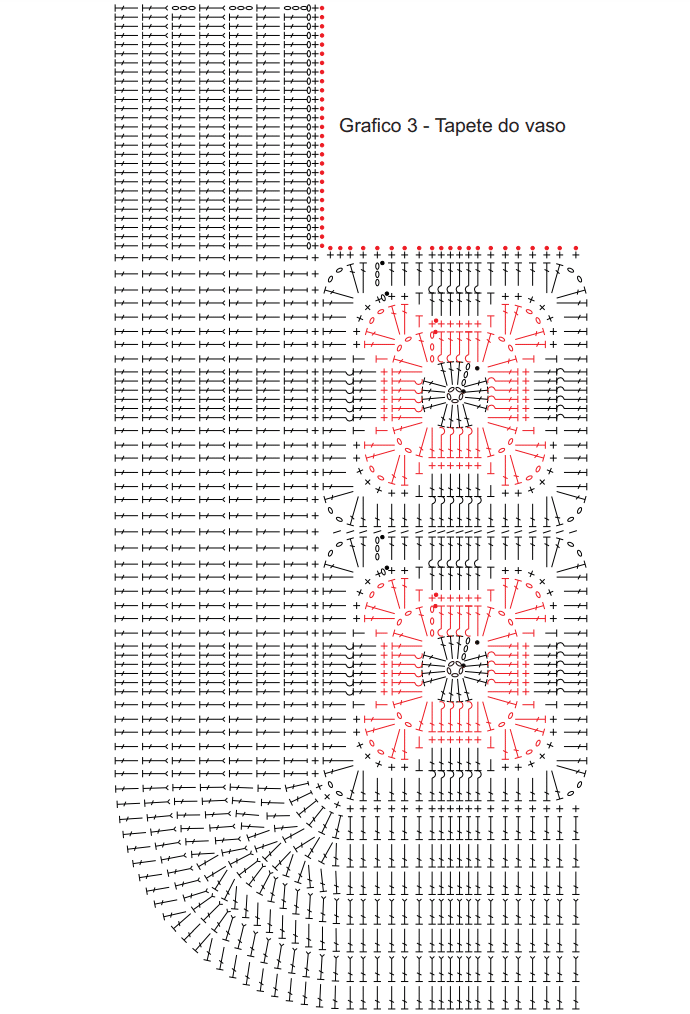 Tapete do vaso: costurar 4 motivos como mostra o esquema de montagem. Fazer 1 carr. de p. baixo ao redor dos motivos unidos. Com o fio na cor porcelana, seguir o gráfico 3. Fazer 1 carr. de p. baixo nas corr. iniciais. Com o fio na cor malagueta, fazer a 1ª listra do gráfico 5 nas corr. inciais e na carr. de p. baixo que foi feita ao redor dos motivos unidos e, depois, na 3ª, 5ª e 7ª carr. do tapete. Com o fio na cor malagueta, fazer 1 carr. de p. bxmo. na parte interna da peça. Por fim, fazer o contorno ao redor da peça seguindo o gráfico 7.