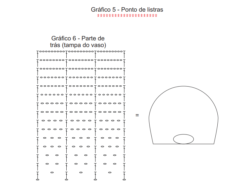 Tampa do vaso: costurar 3 motivos como mostra o esquema de montagem. Fazer 1 carr. de p. alto pegando somente a laçada de trás do ao redor dos motivos unidos. Com o fio na cor porcelana, fazer a parte de cima e a parte de baixo igual. Com o fio na cor malagueta, fazer as listras do grafico 5 nas carr. ímpares das partes de cima e de baixo. Ainda com o fio na cor malagueta, fazer 1 carr. de p. baixo ao redor da peça, prendendo junto a parte de trás. Por fim, fazer o bico de acabamento ao redor da peça seguindo o gráfico 7.