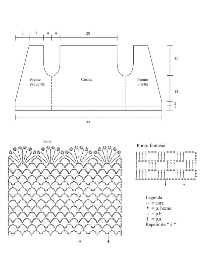 - Pontos utilizados: Correntinha (corr.). Ponto baixíssimo (p. bxmo.): Introduza a ag., laç., puxe o p. e passe diretamente no p. da ag.. Ponto baixo (p. b.): introduza a ag. laç., puxe o p. e com outra laç., rem. todos os p.. Ponto alto (p. a.): laç., introduza a ag., laç., puxe o p. laç., rem., 2 p. e com outra laç., rem. todos os p.. Ponto caranguejo: trabalhe em p. b. da esquerda para direita. Ponto fantasia: siga o gráfico. Gola: siga o gráfico.
